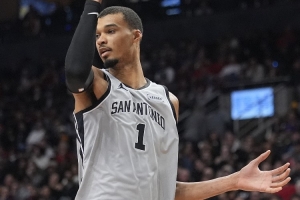 赛后,斯图尔特接受了记者采访。谈到文班亚马,他说道:“他是个高个子,占了很大的空间。我们必须更好地调动他,直接冲击他的胸部(playing straight through his chest)。这对我们有帮助,也是他的弱点所在,当防守者冲向他的胸部时(when he’s got defenders going at his chest),他会挣扎。”